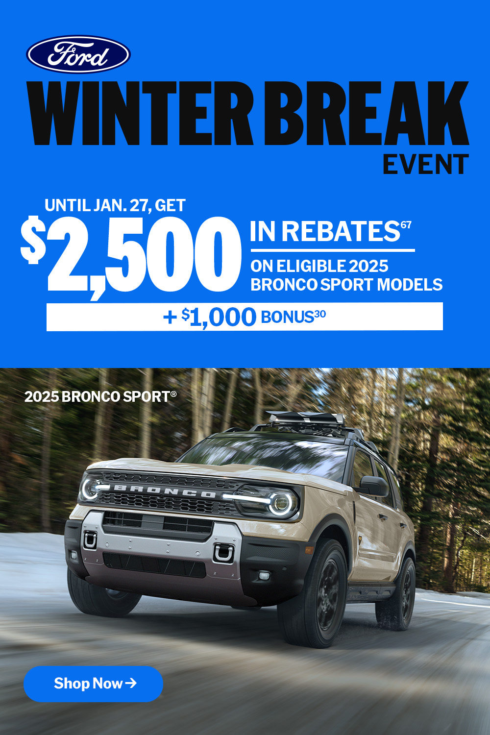 ** Retail offer valid at participating dealers from January 14 – 27, 2026. Dealer trade may be necessary (but may not be available in all cases). Receive $2,500 in Manufacturer Rebates with the purchase or lease of a new 2025 Ford Bronco Badlands model. Not combinable with any fleet consumer incentives.