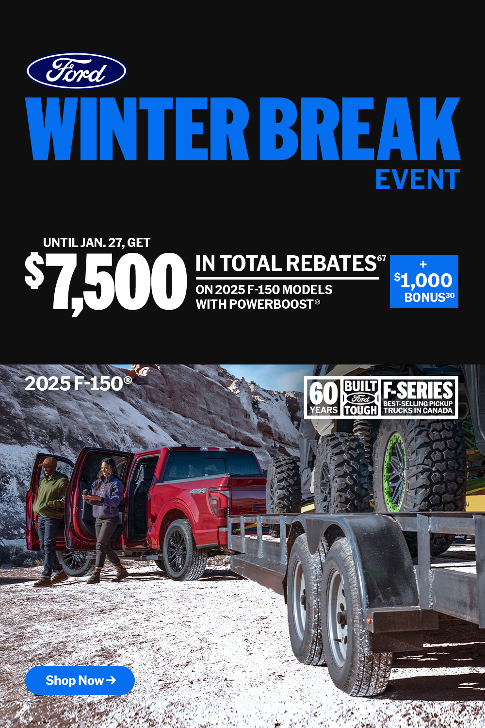*** Retail offer valid at participating dealers from January 14 – 27, 2026. Dealer trade may be necessary (but may not be available in all cases). Receive $7,500 in Total Rebates with the purchase or lease of a new 2025 Ford F-150 XLT, Lariat, King Ranch or Platinum model with a 3.5L PowerBoost® Full Hybrid V6 engine. “Total Rebates” are a combination of $6,500 Delivery Allowance and $1,000 PowerBoost® Bonus rebates on eligible models. Not combinable with any fleet consumer incentives.