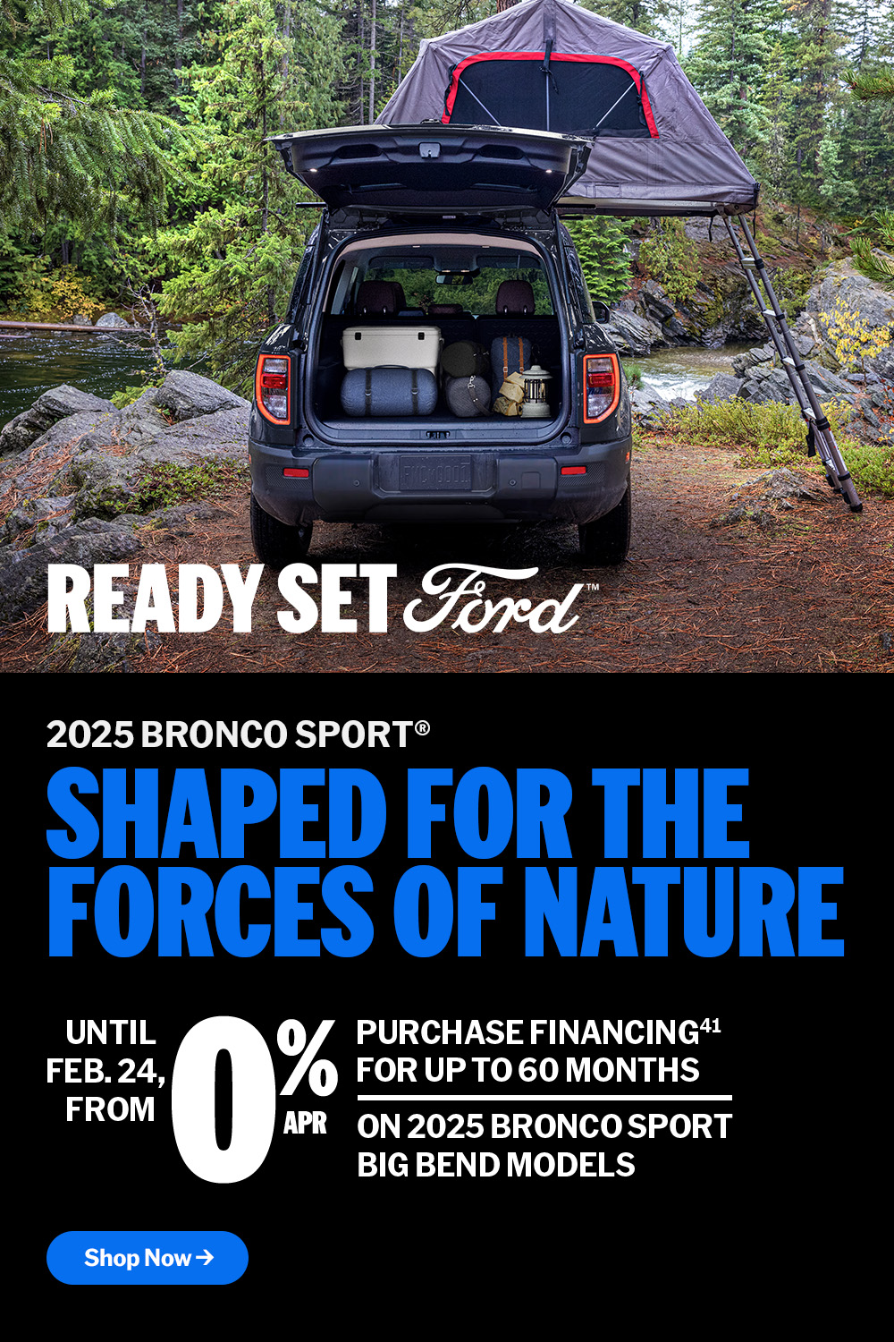 ** Retail offer valid at participating dealers from February 11 – 24, 2026. Dealer trade may be necessary (but may not be available in all cases). Receive purchase financing from 0% APR for up to 60 months on a new 2025 Ford Bronco Sport Big Bend model on approved credit from Ford Credit Canada Company for qualified retail customers. Not everyone will qualify for this offer or the lowest interest rate. Dealers set selling price and may sell for less. Example: Finance $41,190 with $0 down payment at 0% APR for 60 months, monthly payment is $687 (total of 60 monthly payments); interest cost of borrowing is $0; and total to be repaid is $41,190 (except in Quebec where the total is $41,249 which includes $59 fee related to the RDPRM registration payable upon signature). See your Ford dealer for details.