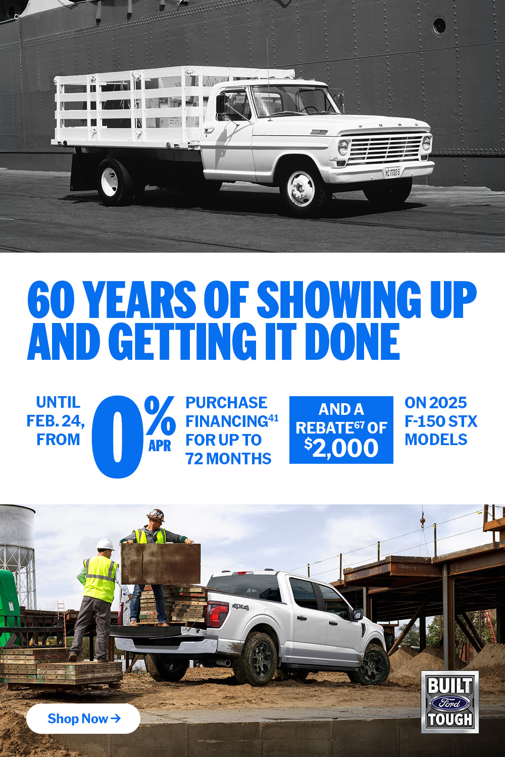** Retail offer valid at participating dealers from February 11 – 24, 2026. Dealer trade may be necessary (but may not be available in all cases). Receive purchase financing from 0% APR for up to 72 months on a new 2025 Ford F-150 STX model on approved credit from Ford Credit Canada Company for qualified retail customers. Not everyone will qualify for this offer or the lowest interest rate. Dealers set selling price and may sell for less. Example: Finance $65,000 with $0 down payment at 0% APR for 72 months, monthly payment is $903 (total of 72 monthly payments); interest cost of borrowing is $0; and total to be repaid is $65,000 (except in Quebec where the total is $65,059 which includes $59 fee related to the RDPRM registration payable upon signature). See your Ford dealer for details.